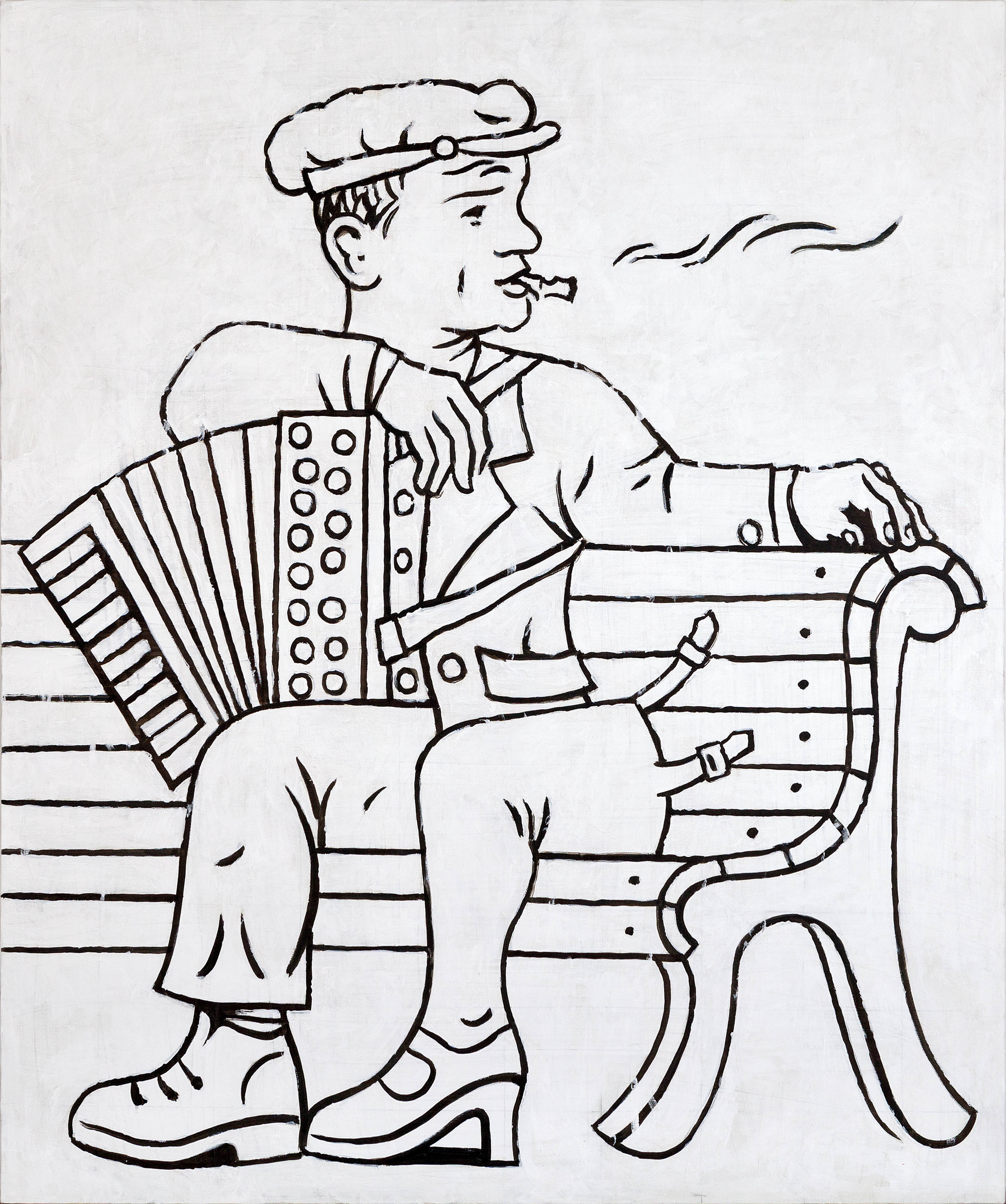 Все до одной картины этой бесконечной серии, хотя и написаны маслом на холсте, сознательно эмансипируют от привычной живописной ориентации и представляют собой картины — схемы, рисунки — руководства к действию. Голая линия подчеркивает внутреннюю точность жеста. Отсутствие цвета акцентирует конкретную определенность сюжета. Принцип «моментального снимка» положен в концептуальную основу художественного высказывания. Внешнее узнавание нарисованной истории происходит одновременно с ее фактическим происшествием на наших глазах. Время рассмотрения картины примерно равно времени нарисования этой картины. Эмоциональная составляющая тождественна логической целесообразности. Форма и содержание становятся одним целым. Здесь, как в караоке, стиль и способ высказывания не должны тормозить автоматический поток сознания. Единственная задача — установить быструю связь между конкретным зрителем и абстрактной коллективной памятью.