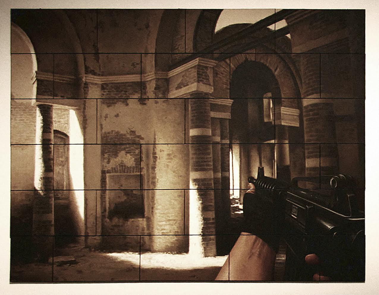 Он сталкивает материальное и виртуальное. Руины романского храма, обломки древней цивилизации, где мы до сих пор существуем, где давно нет новостей, все клады отрыты, все сокровища найдены. Картины пустые, центральный персонаж отсутствует, но мы, повинуясь инстинкту охотника, бродим по этим развалинам, пытаясь снова и снова найти свою жертву, обрести свою цель, а главное – вернуть из глубины ускользающее туда от нас пространство.